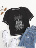 Triple Skeleton Baskılı Ters Dikiş Siyah Crop