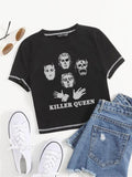 Killer Queen Baskılı Ters Dikiş Siyah Crop