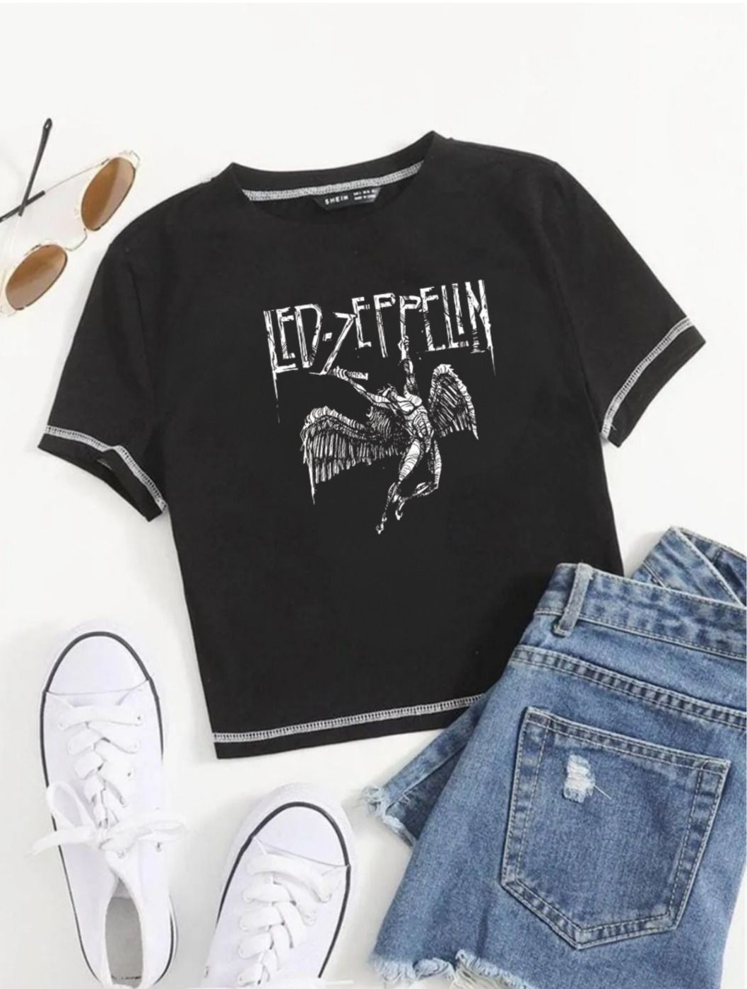 Led Zeppelin Baskılı Ters Dikiş Siyah Crop